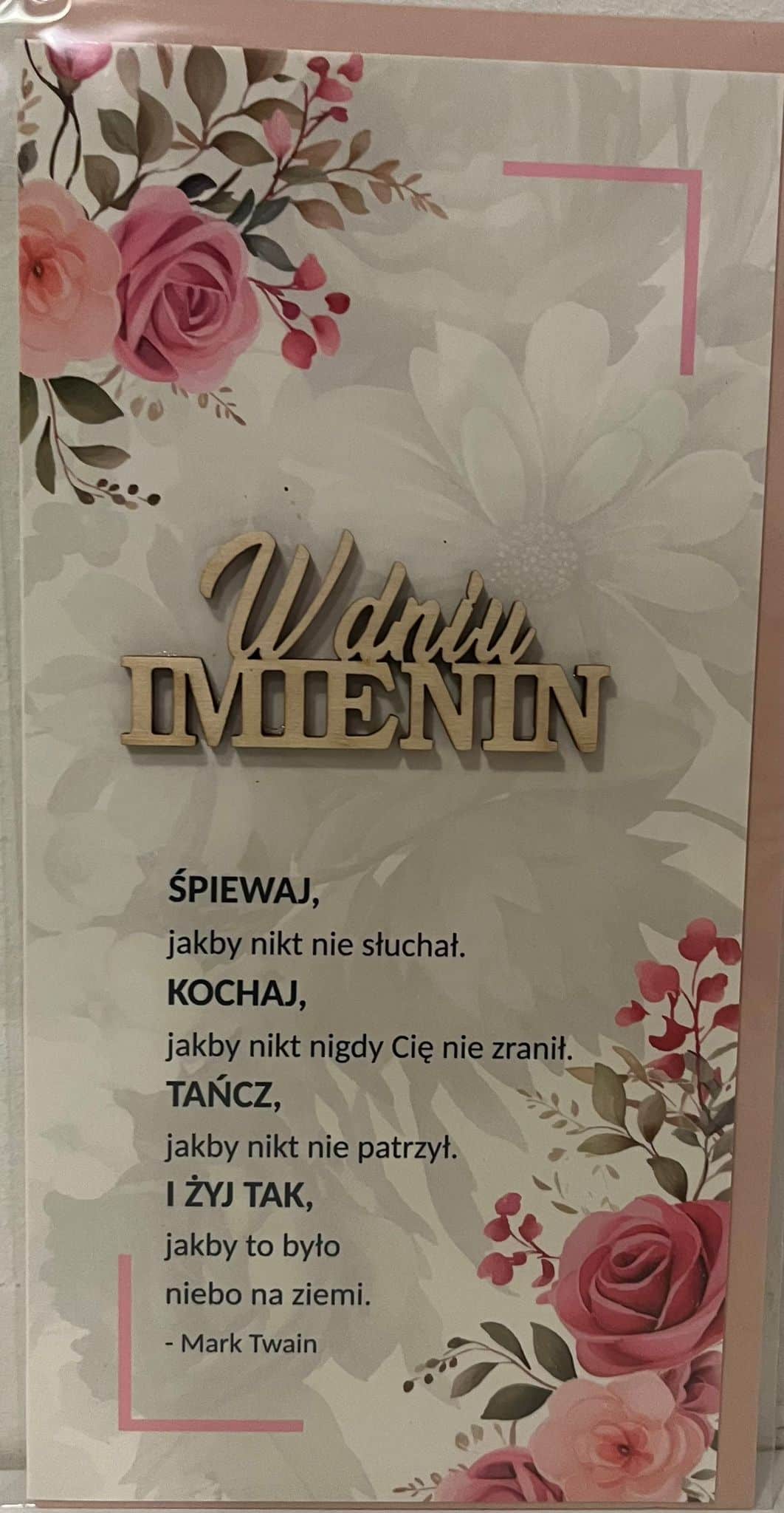 Elegancka kartka imieninowa utrzymana w delikatnej, pastelowej kolorystyce z pięknym motywem różowych kwiatów i subtelną grafiką liści. Centralnym punktem jest stylowy, drewniany napis „W dniu imienin”, który nadaje kartce wyjątkowego charakteru i elegancji.