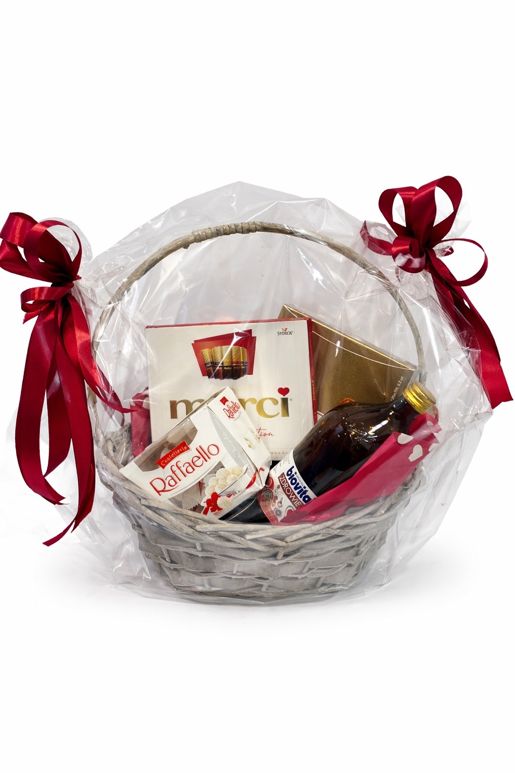 Kosz prezentowy składa się z Merci 250g, Raffaello 150g, pralinek i Biovital 1l.