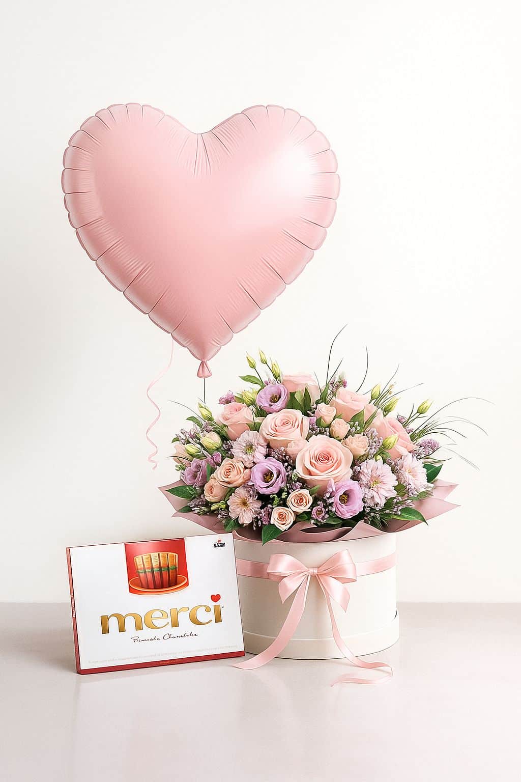 Zestaw uzupełnia balon w kształcie serca w odcieniu pudrowego różu – symbol czułości, miłości i słodkich emocji, który pięknie dopełnia kompozycję. Dodatkowo zestaw zawiera elegancką czekoladkę, tworząc idealny prezent na Walentynki, rocznicę, urodziny lub każdą chwilę, którą chcesz zamienić w wyjątkową.